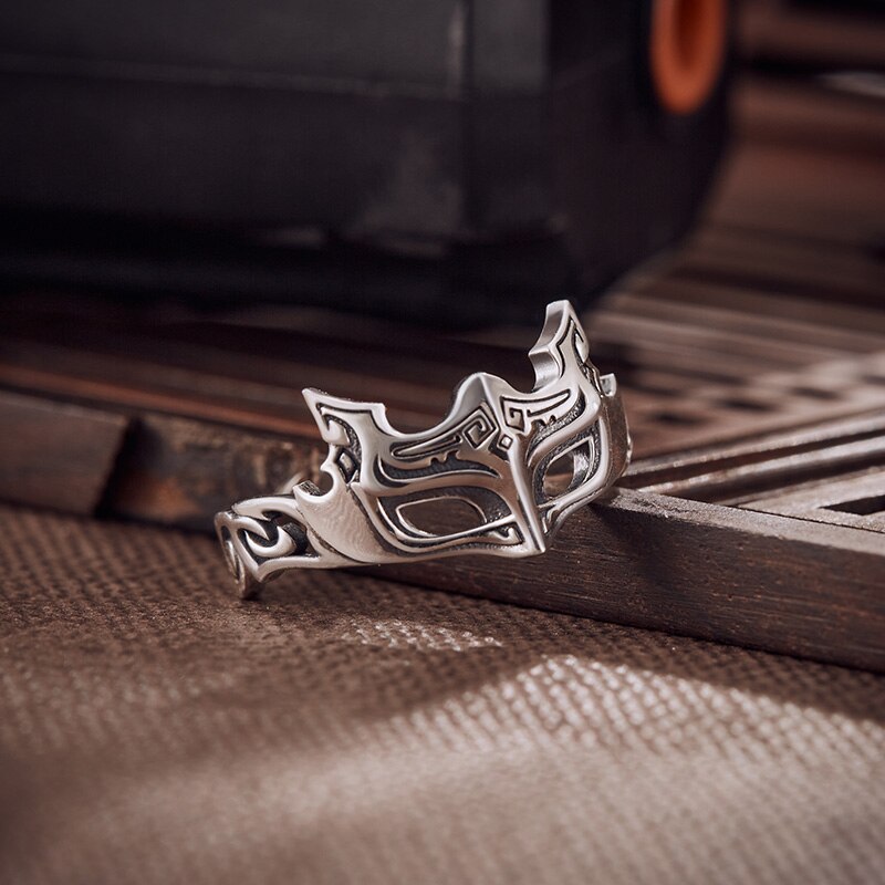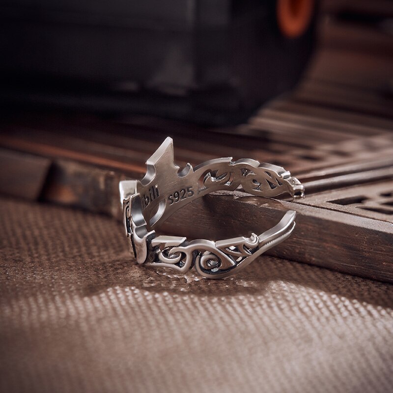 Sheng Wang Dragon Ring est une bague complexe fabriquée à la main en argent sterling et en laiton doré. Le design circulaire de la bague dragon est inspiré du signe du zodiaque chinois du Dragon. La bague a un total de 8 pétales, chacun finement sculpté avec différents symboles représentant différents aspects de la vie tels que la richesse, la santé et l’amour.
